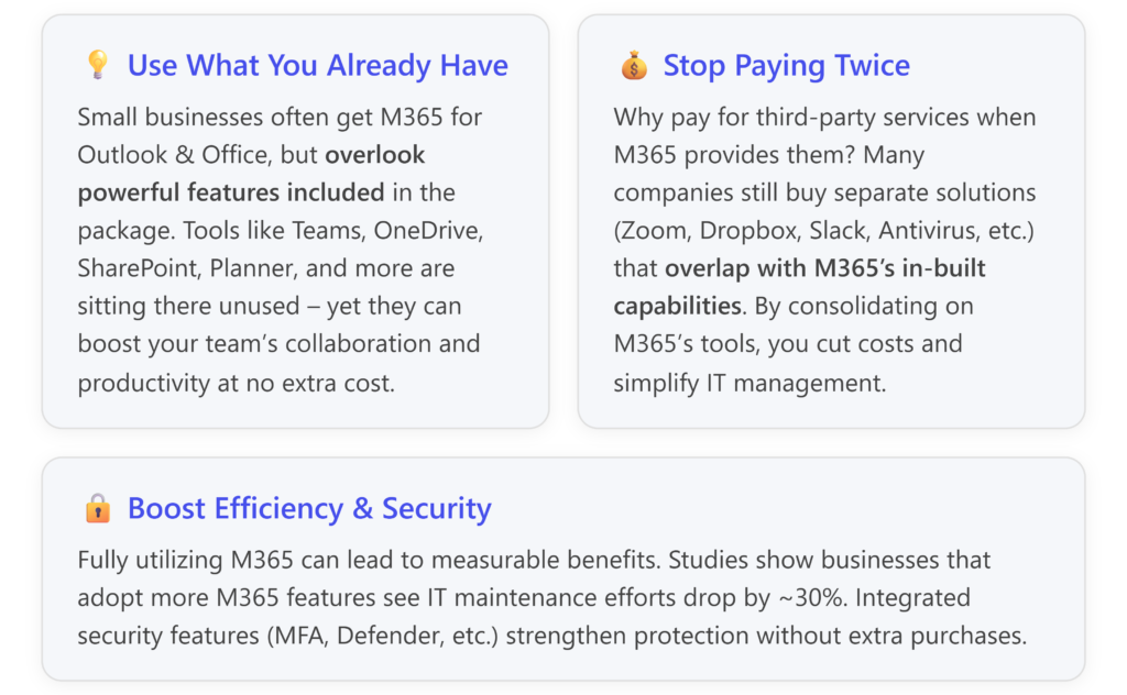 By making full use of your Microsoft 365 subscription, you can improve your company’s efficiency and security with tools you already pay for – effectively getting more bang for your buck. It might require some initial effort to adopt new workflows, but the payoff in productivity and cost savings is well worth it. Don’t let those powerful features gather dust; deploy them and watch your small business run like a much bigger one!