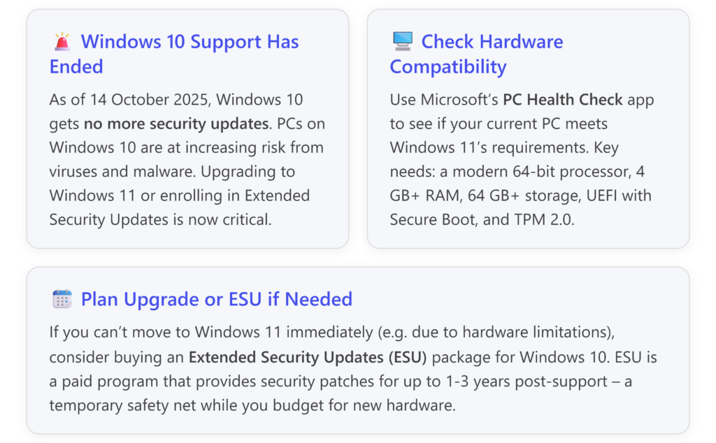 Microsoft has ended support for Windows 10 on October 14, 2025, which means it no longer receives security updates or bug fixes. Continuing to run Windows 10 now is a bit like leaving the doors to your business unlocked – your PC will still work, but it’s exposed to new threats. Upgrading to Windows 11 ensures you stay protected and compliant with modern security standards. Here’s how to plan a smooth migration: [support.mi…rosoft.com]